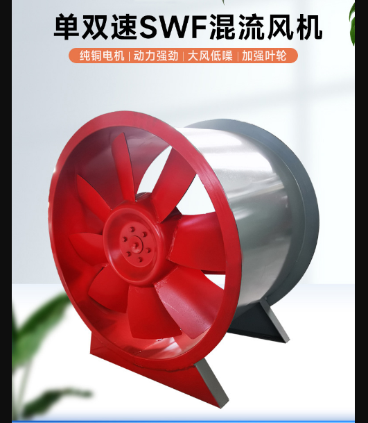 混流(斜流)風機,風壓系數(shù)比軸流風機高,流量系數(shù)比離心風機大,用在風壓和流量都“不大不小”的場合。它填補了軸流風機和離心風機之間的空白。同時具備安裝簡單方便的特點。