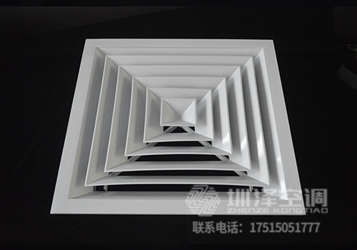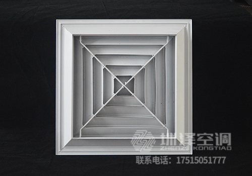 方形散流器先調(diào)挺直,表面光潔,葉片角度為固定式,葉片采用夾角片沖壓連接,整個葉片與邊框采用分離式結構,以方便安裝與調(diào)節(jié)。設計時可根據(jù)房間造型不同,選用不同出風方向的散流器,可與調(diào)節(jié)閥配套使用。方形散流器有四種氣流吹出形式,分別為一面吹(A1SO)、二面吹(A2SO)、三面吹(A3SO)、四面吹(A4SO)。鋁合金表面經(jīng)陽極氧化處理,也可根據(jù)用戶要求進行靜電噴塑處理。